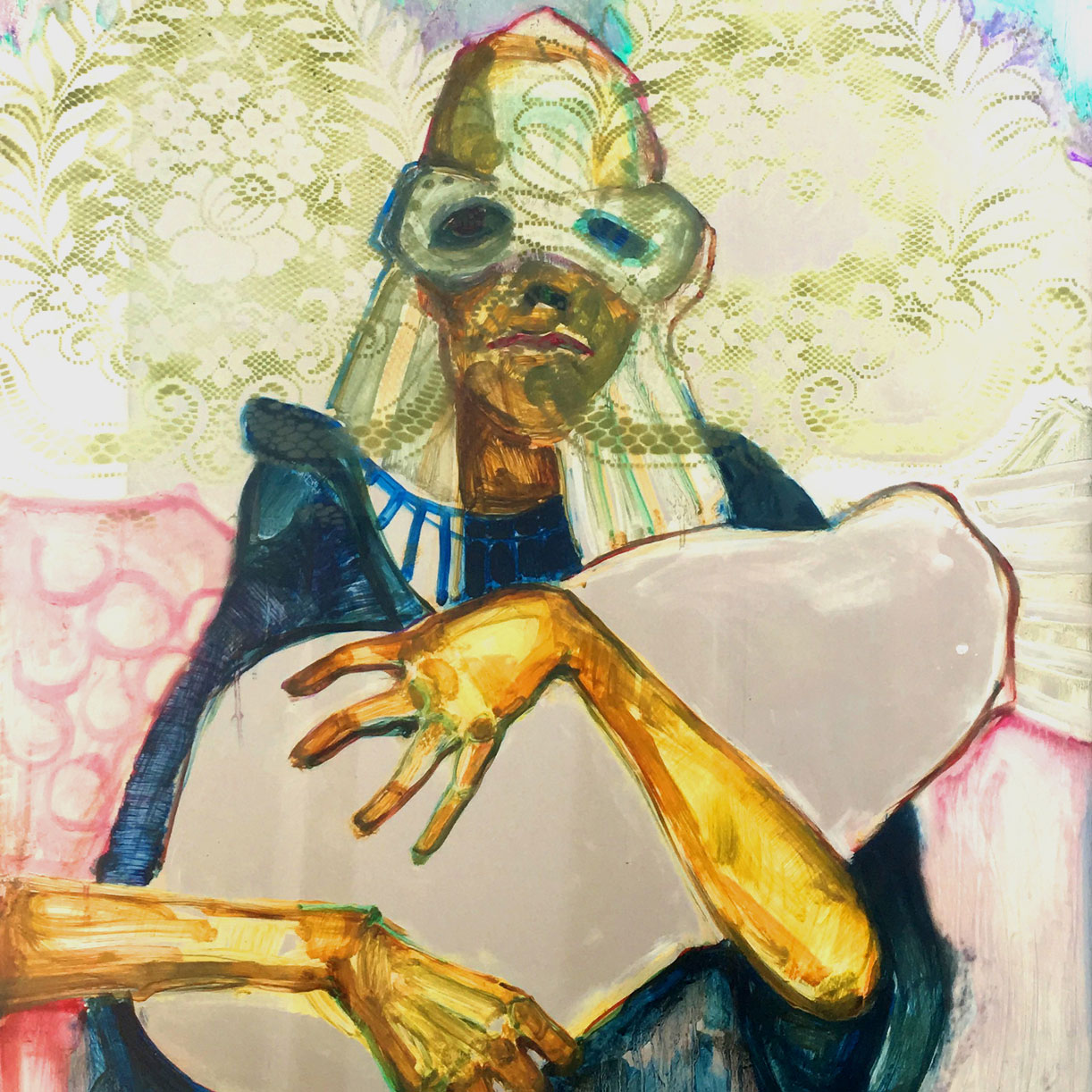 Mit seinen gemalten Figuren reagiert der georgische, in Stuttgart lebende Künstler Shalva Gelitashvili, auf die Absurditäten des Alltags. Menschliche Protagonisten, Tierwesen, Spielzeuge und Gerätschaften vereinen sich in seinen Arbeiten zu surrealen Szenerien. Symbolträchtige Körperhaltungen und Requisiten, expressive Mimik und grelle Farben machen die Betrachtung zum Erlebnisprozess. Schützen die Masken und Maskeraden die Gemalten oder eher die Betrachtenden? Seine begehbare Installation aus Malereien auf Glasscheiben alter Abbruchhäuser weckt Assoziationen an Kirchenfenster und Heiligenbilder.
